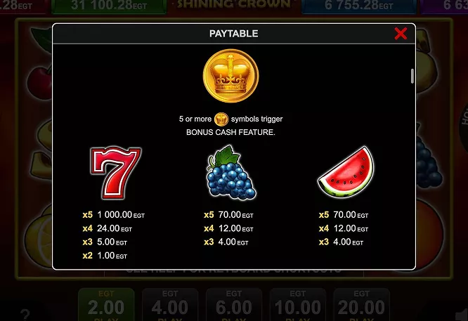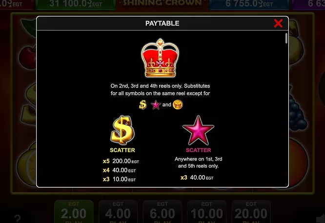 aDiscover all the essential details about Shining Crown by EGT (Amusnet). This section covers the game’s structure, symbols, RTP, volatility, and bonus features, giving you a clear overview before you start playing. Whether you prefer testing the demo or aiming for the progressive jackpot, these specs help you understand how the slot works and what makes it stand out among classic fruit machines.